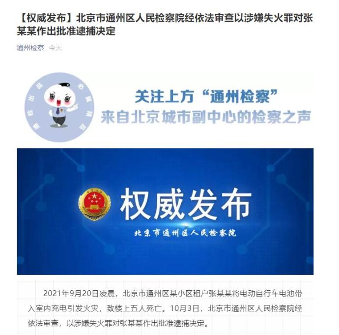 据通州检察微信公众号消息,2021年9月20日凌晨,北京市通州区某小区租户张某某将电动自行车电池带入室内充电引发火灾,致楼上五人死亡。10月3日,北京市通州区人民检察院经依法审查,以涉嫌失火罪对张某某作出批准逮捕决定。