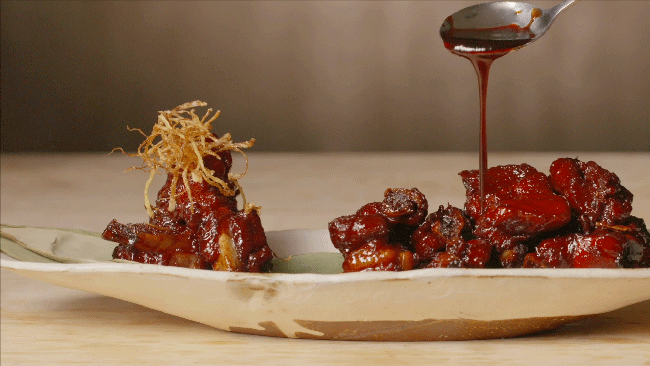 霸王排骨是我们做过的排骨最霸气的做法,一整块弓型排骨,经过卤、炸、炒三步,味道层层渗透,香味馋人。
