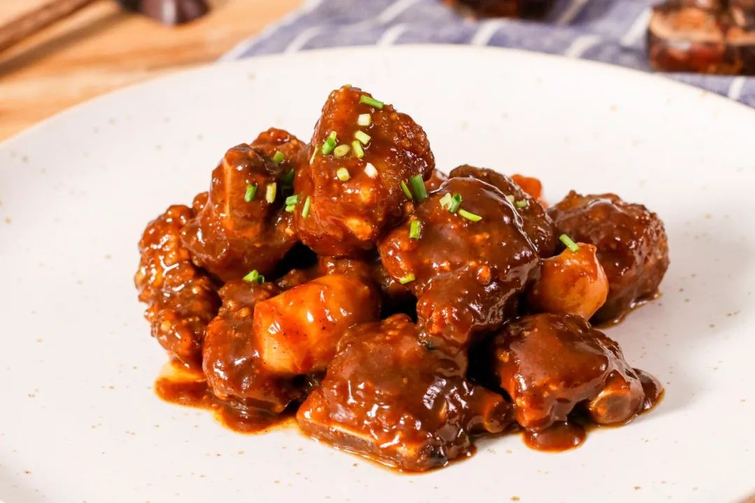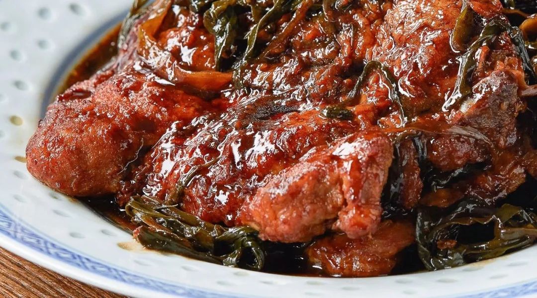 㸆是一种给食材补充味道的烹饪方法,一般通过小火,让两种食材的味道互相渗透,讲究的是“互相依靠,融汇渗透”。鲁菜有葱㸆海参,粤菜有㸆鲍鱼,而做猪骨,上海有葱㸆大排。