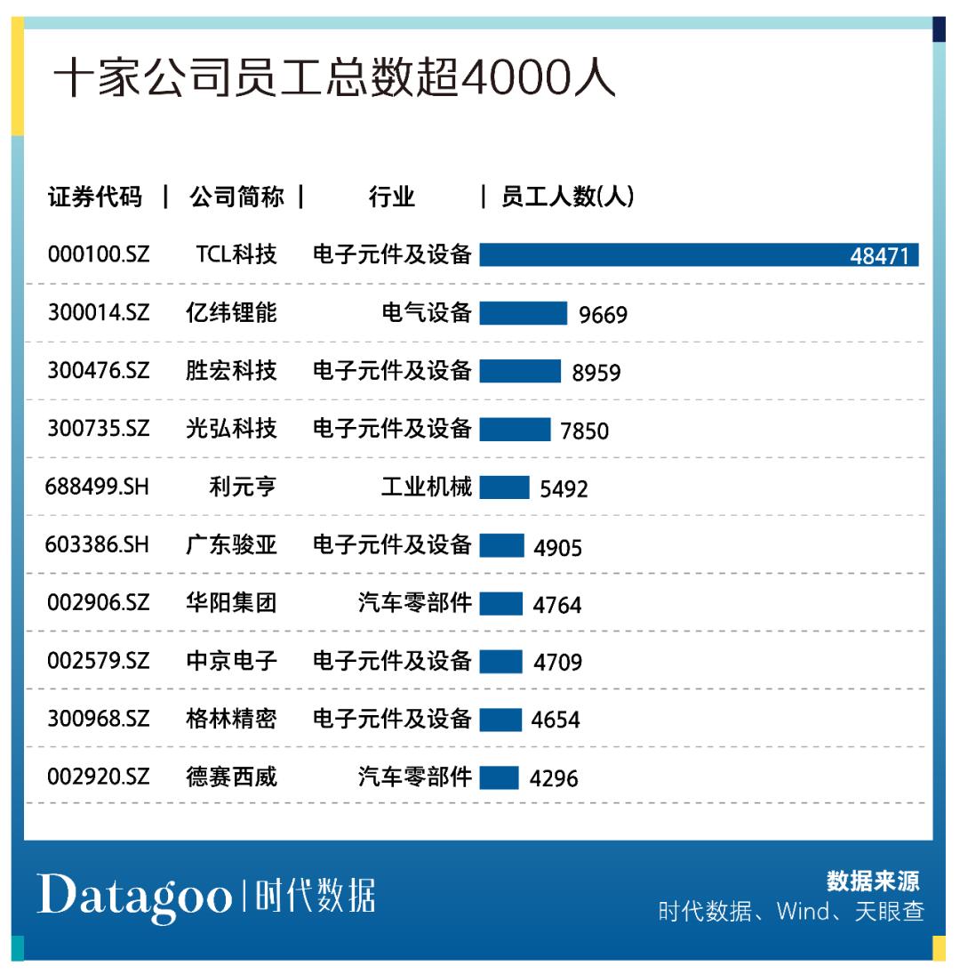 据时代数据统计,这15家上市公司的员工总数约11.12万人。其中,全球半导体显示行业领导企业TCL科技(000100)创造的就业岗位最多,拥有员工约4.85万人;其后,全球领先的锂原电池、锂离子电池供应商亿纬锂能(300014)拥有员工9669人,位列第二;全球领先的印制电路板制造企业胜宏科技(300476)拥有员工8959人,位列第三。
