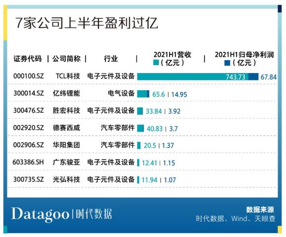 其中,TCL科技(000100)业绩雄踞第一,上半年营收743.73亿元、归母净利润67.84亿元。其后,亿纬锂能(300014)上半年营收65.6亿元、归母净利润14.95亿元,排在第二;胜宏科技(300476)上半年营收33.84亿元、归母净利润3.92亿元,排在第三。