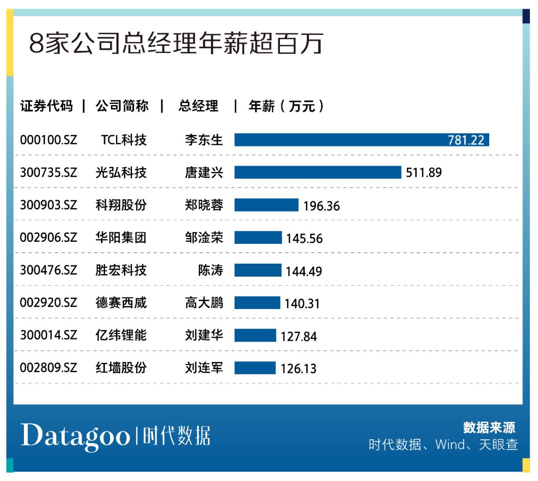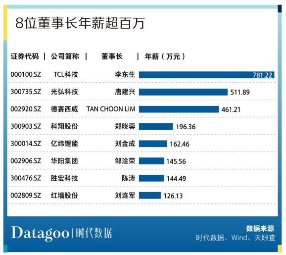 据时代数据统计,在这15家公司中,一共有8家公司的董事长2020年年薪超过100万元。其中,最高的是TCL科技(000100)董事长兼总经理李东生,年薪达到781.22万元;其次是光弘科技(300735)董事长兼总经理唐建兴,年薪511.89万元;第三是德赛西威(002920)董事长TAN CHOON LIM,年薪461.21万元。