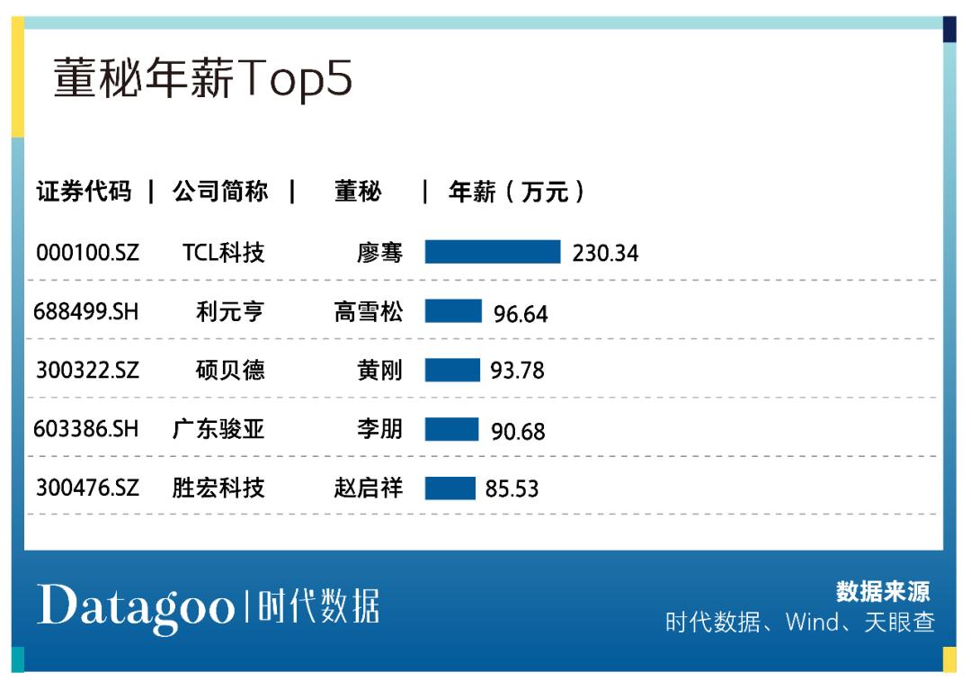 相较之下,惠州上市公司董秘年薪普遍较低。据时代数据统计,在这15家公司中,仅1家公司的董秘2020年年薪超过100万元,为TCL科技(000100)董秘廖骞,年薪230.34万元。