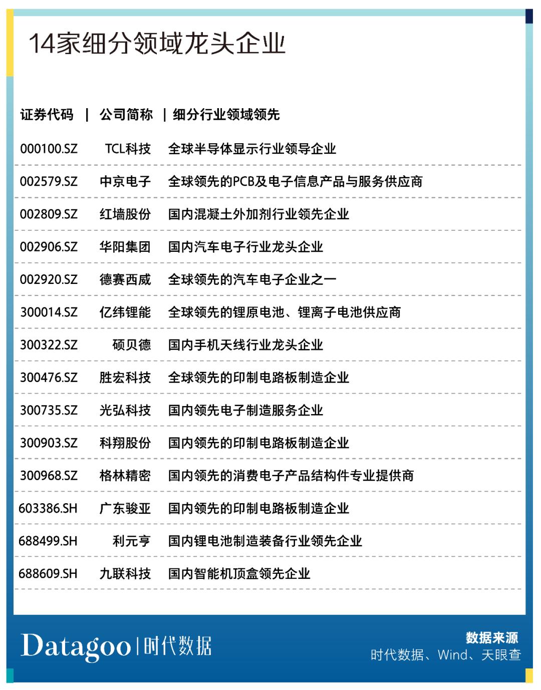 据时代数据梳理,在15家公司中,有14家公司属于各个行业细分领域的龙头型企业,占比达93.33%。其中,TCL科技(000100)、中京电子(002579)、德赛西威(002920)、亿纬锂能(300014)、胜宏科技(300476)的核心技术、主要产品或其市场份额已经做到全球领先。