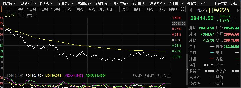 与此同时,日本股市亦持续低迷。日经指数连跌第六天,今早曾扭转上周五急挫2.3%势,反弹275点至29046点无以为继,掉头低见28,359点,收盘杀跌近1%。欧洲股市开市后延续跌势,英国富时100指数低开0.35%,德国DAX指数跌0.69%,法国CAC40指数跌0.61%。