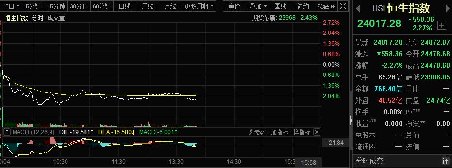 10月4日,香港市场迎来国庆之后第一个交易日。恒指低开96点,其后跌幅曾扩大至667点见23908点半日低位。半日跌553点或2.3%,报24,022点;国指跌212点或2.4%,报8,514点。午后,两大指数皆在小幅反弹之后,跌幅再度加大。