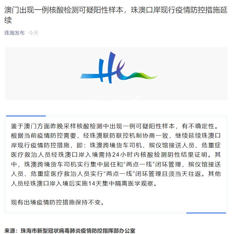 另据“珠海发布”消息,根据当前疫情防控需要,经珠澳联防联控机制协商一致,继续延续珠澳口岸现行疫情防控措施,即:珠澳跨境货车司机、殡仪馆接送人员、危重症医疗救治人员经珠澳口岸入境需持24小时内核酸检测阴性结果证明。其中,珠澳跨境货车司机实行集中居住和“两点一线”闭环管理,殡仪馆接送人员、危重症医疗救治人员实行“两点一线”闭环管理且须当天往返。其他人员经珠澳口岸入境后实施14天集中隔离医学观察。现有出境疫情防控措施保持不变。