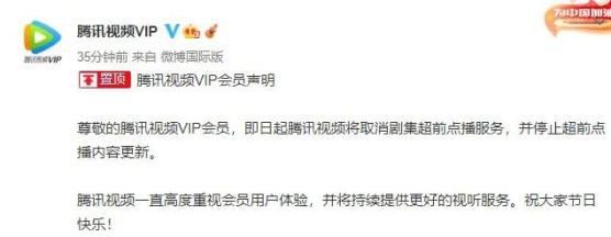 10月4日,@腾讯视频VIP 发布《腾讯视频VIP会员声明》,取消剧集超前点播服务。全文如下: