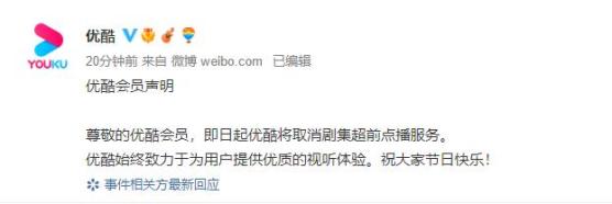 10月4日,@优酷 发布《优酷会员声明》,称即日起优酷将取消剧集超前点播服务。