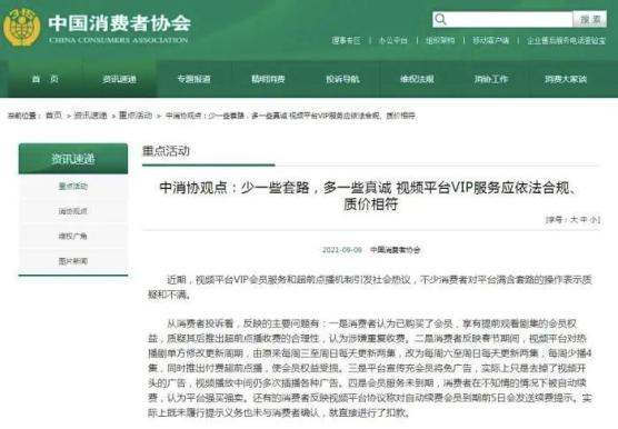 9月9日,中国消费者协会发文,就视频平台的VIP会员服务和超前点播机制发声。中消协认为,超前点播应尊重自愿,并提出了相关平台取消逐集限制、计费规则得遵守公平等要求。“少一些套路,多一些真诚”,既是消费者协会的呼吁,也是广大被收割的会员用户的心声。