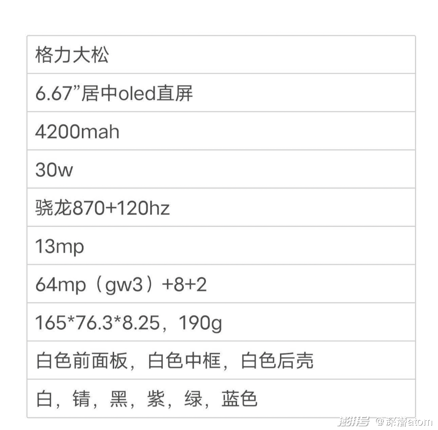 格力新机拥有一块6.67英寸120Hz居中打孔OLED直屏,搭载骁龙870处理器,采用后置三摄方案:64MP+8MP+2MP,前置为13MP单摄,配备了4200mAh电池,支持30W快充。