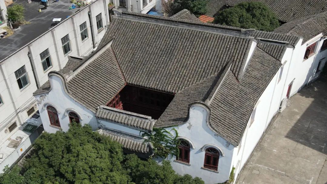 印家住宅位于嘉定区南新路169号,始建于清末,占地面积1000多平方米。从空中俯瞰,印家住宅沿着横沥河的流向依势而建。屋顶错落有致,硬山顶和观音兜交织出刚柔并蓄的天际线,是江南传统民居的典型代表。