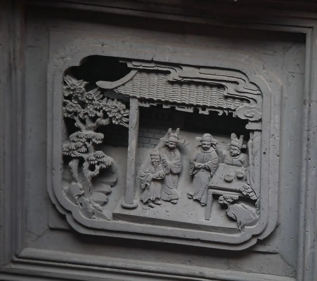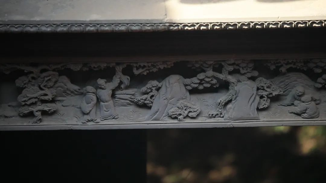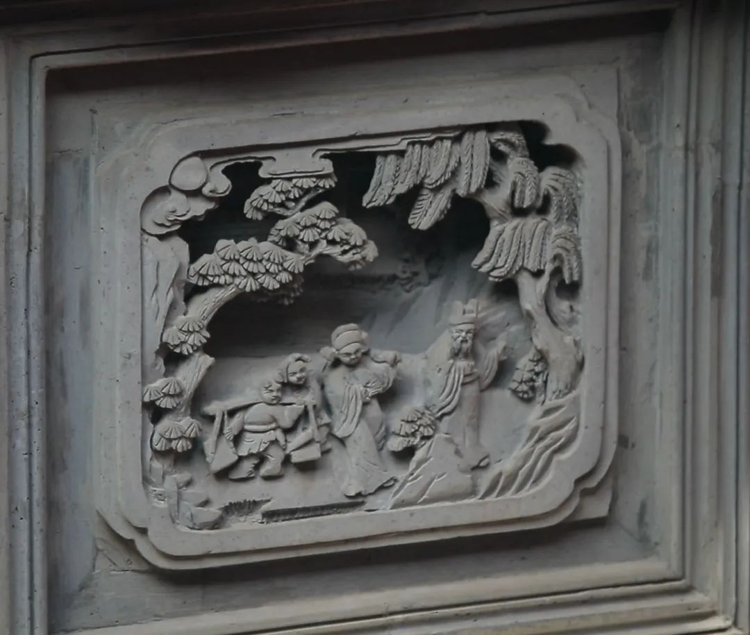 上枋雕刻的是松石延年图,中枋雕有“进京赶考”和“状元及第”透雕图,下枋则刻画了文人和僧侣在月光下赋诗论道的场景,体现了印家崇信孝道的家训和宁静淡泊的品格。