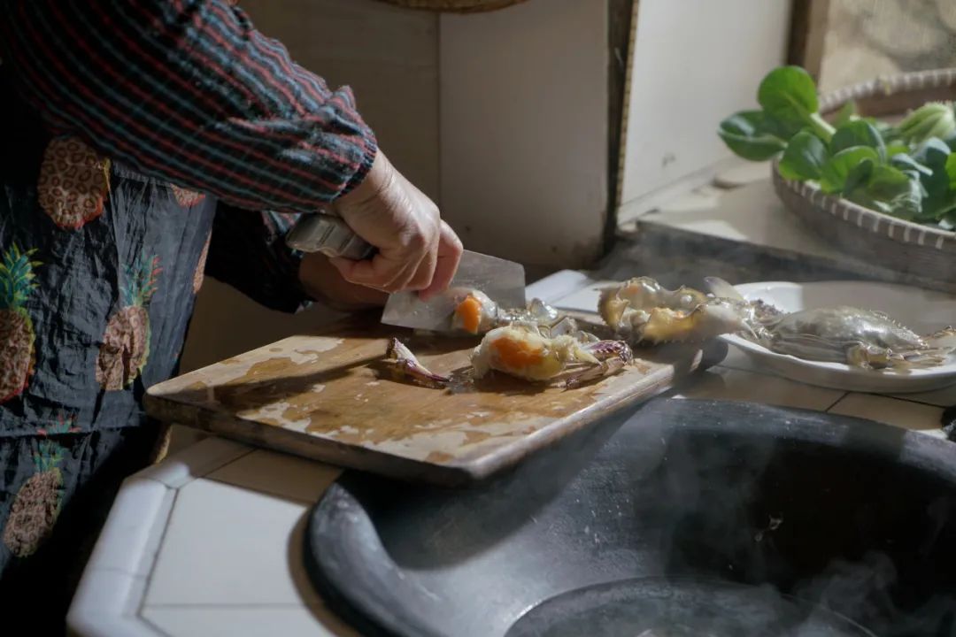 被切成小块的梭子蟹带着红膏 —— 这是每只蟹的“军功章”,没膏的蟹是不灵的,拿白酒、糖、盐、姜一拌,吃的时候要吸起来嘬,当一块蟹膏杂着浓烈调料从舌尖和鼻尖两个通道一起进入身体,肺像被洗了一边,通透得紧。