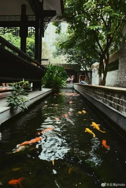 从繁华林立的高楼走到安静的十香园,这里青砖古瓦的矮墙仿佛与世隔绝,连墙内的时光也停滞了。凉亭下一汪碧池中,数十条锦鲤游动着,简直太诗意了!