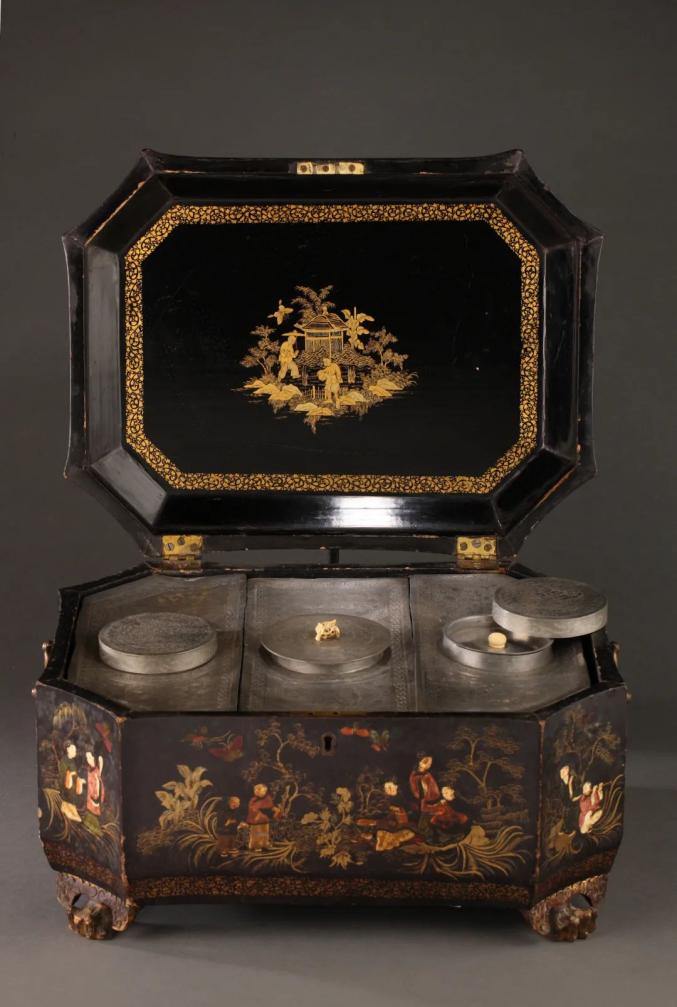 黑漆描金彩绘人物纹锡胆茶叶罐 清末