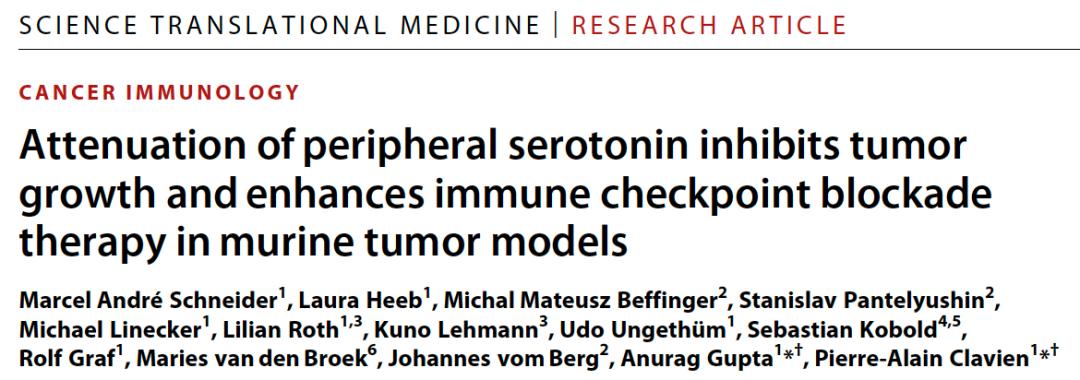 近日,苏黎世大学的研究人员在 Science 子刊 Science Translational Medicine 上发表了题为:Attenuation of peripheral serotonin inhibits tumor growth and enhances immune checkpoint blockade therapy in murine tumor models 的研究论文。