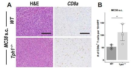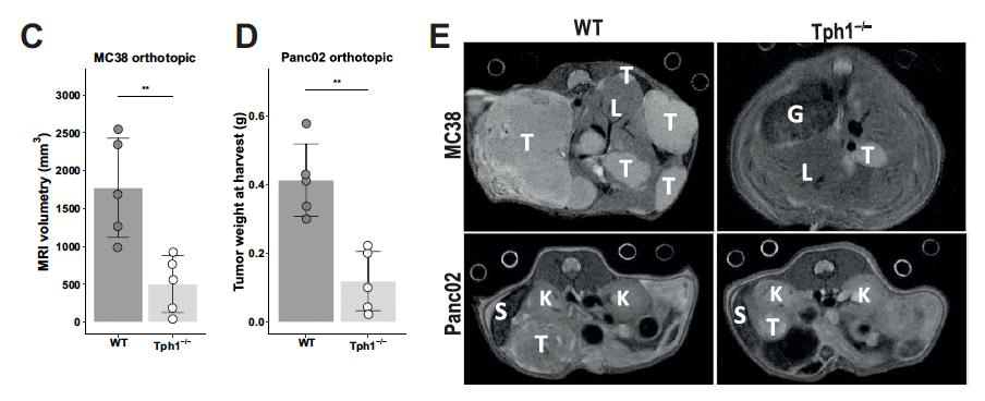 血清素的分布方式与它的限速酶有关。血清素的限速酶是色氨酸羟化酶(TPH),TPH由两个基因编码,分别是TPH1和TPH2。中枢神经系统和神经元中血清素的产生完全依赖于TPH2,而TPH1主要表达在肠粘膜的肠嗜铬细胞中,被血小板吸收,在炎症或损伤部位释放。血清素作为一种重要的炎症介质,影响免疫功能,还与细胞增殖和癌症相关。然而,血清素对肿瘤微环境的影响尚不清楚。