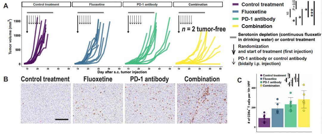 最后,他们研究了在治疗环境中,血小板中血清素含量的减少是否会抑制肿瘤的生长。他们对野生型小鼠皮下注射癌细胞,并分别给予:对照注射、连续氟西汀单药治疗、双抗PD-1单药治疗或氟西汀加抗PD-1组合治疗。与对照组相比,两种单一疗法均降低了肿瘤生长并增加了肿瘤中CD8+T细胞的浸润。与单一疗法相比,组合治疗显示出增益效应,改善了肿瘤控制和CD8+T细胞浸润,能够在20%的小鼠中根除大型肿瘤。
