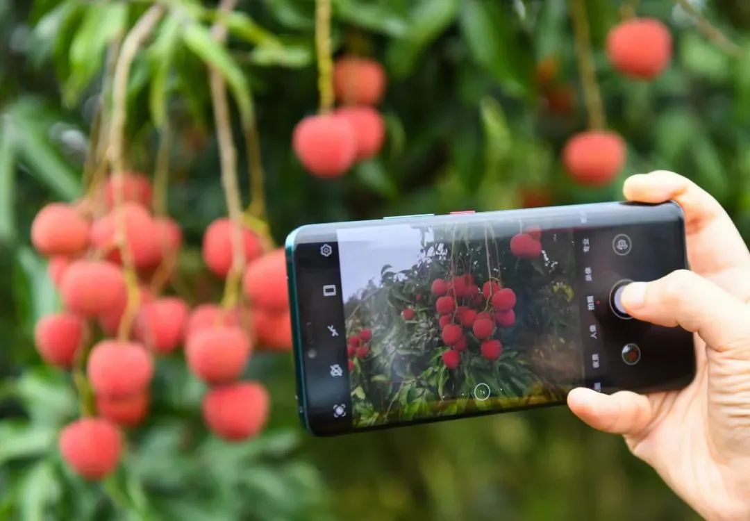 在广东茂名高州市根子镇荔枝贡园,一名游客拍摄成熟的荔枝。新华社记者 邓华 摄