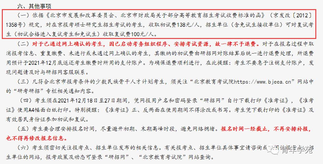 对在京报考硕士研究生招生考试的考生,收取初试费138元/人,招生单位(含免试生接收单位)可对复试考生(初试合格进入复试考生和免试生)收取复试费100元/人。