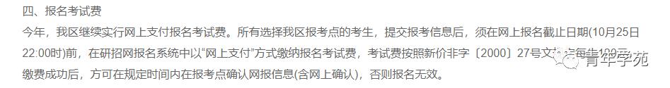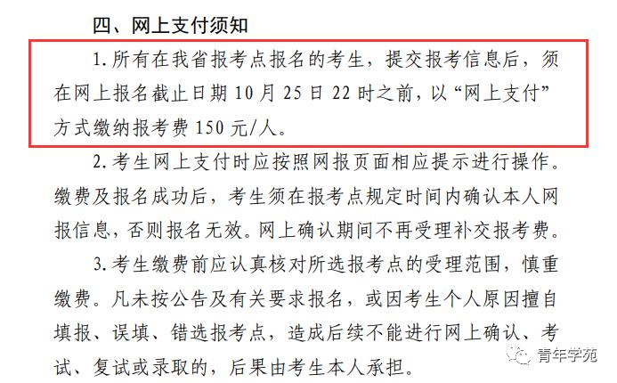 所有在黑龙江省报考点报名的考生,提交报考信息后,须在网上报名截止日期10月25日22时之前,以“网上支付”方式缴纳报考费150元/人。
