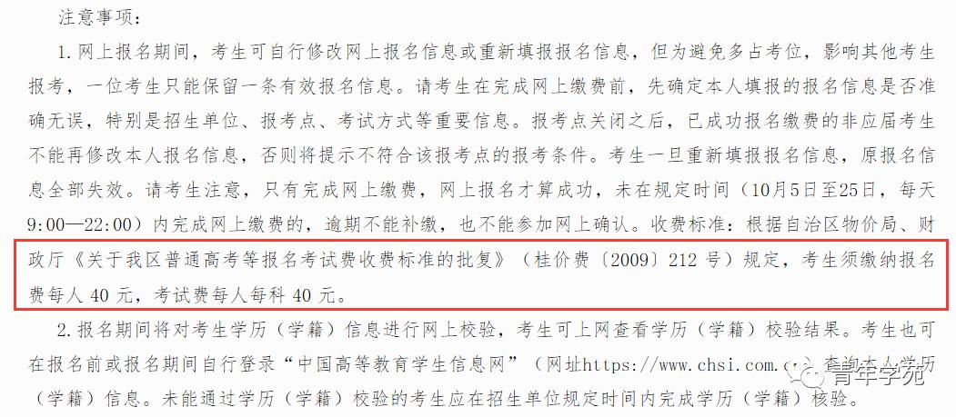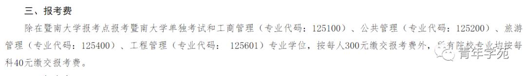 除在暨南大学报考点报考暨南大学单独考试和工商管理(专业代码:125100)、公共管理(专业代码:125200)、旅游管理(专业代码:125400)、工程管理(专业代码:125601)专业学位,按每人300元缴交报考费外,所有院校专业均按每科40元缴交报考费。