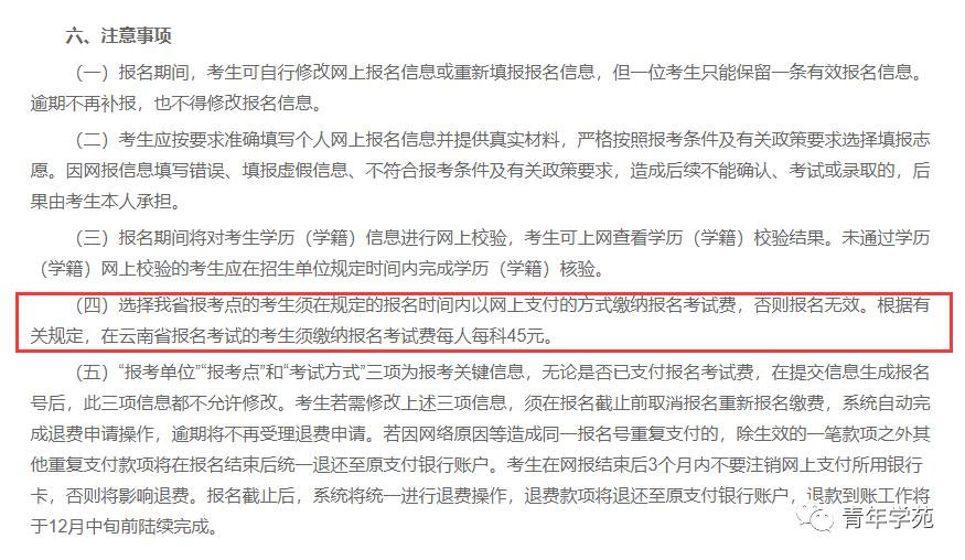 根据有关规定,在云南省报名考试的考生须缴纳报名考试费每人每科45元。