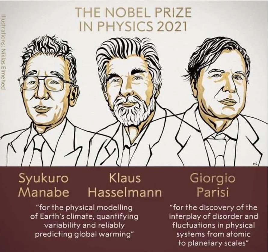 2021年诺贝尔物理学奖于北京时间10月5日正式揭晓,美国科学家真锅淑郎(Syukuro Manabe)、德国科学家克劳斯·哈塞尔曼( Klaus Hasselmann)和意大利科学家乔治·帕里西(Giorgio Parisi )荣膺,“以表彰他们为我们理解复杂物理系统所作出的开创性贡献”。