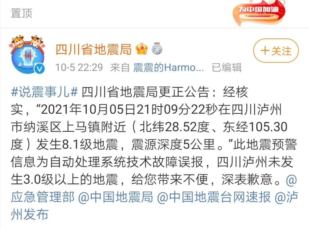 10月5日晚,四川省地震局因地震预警误报向公众致歉。
