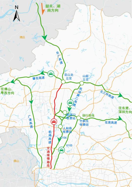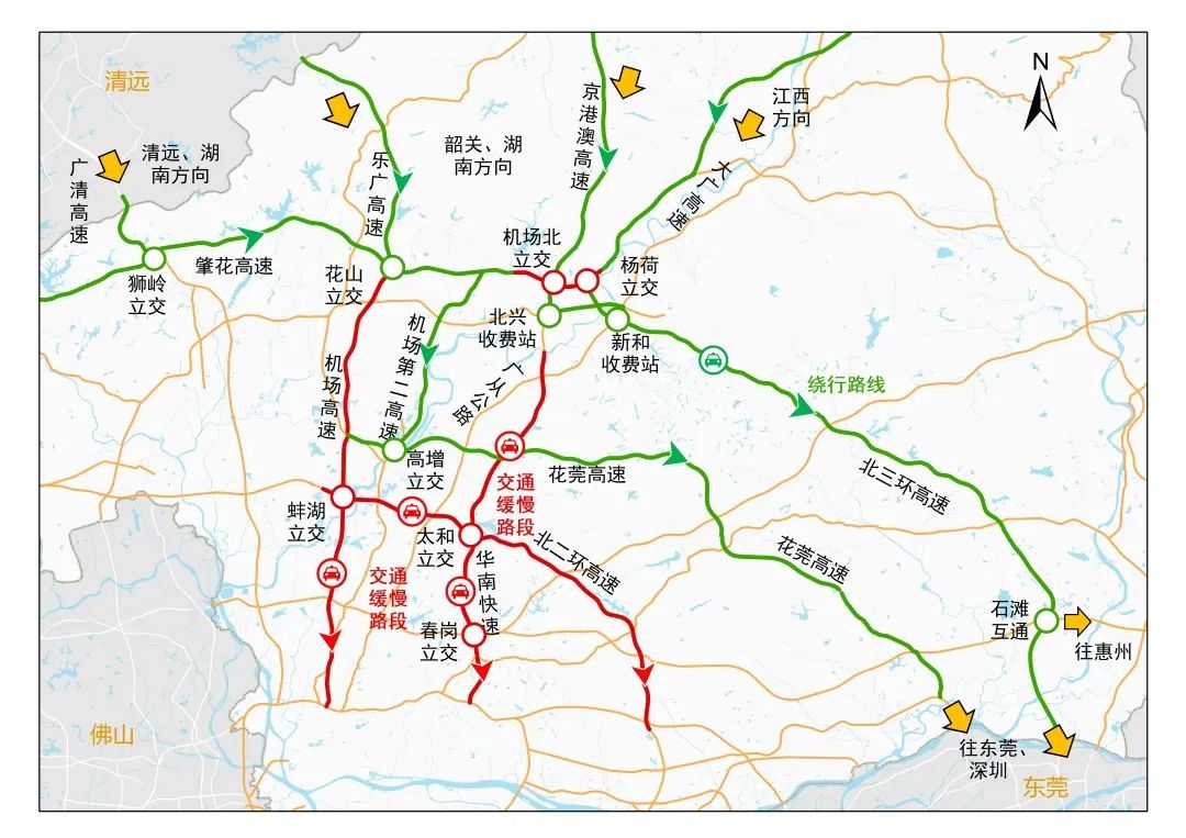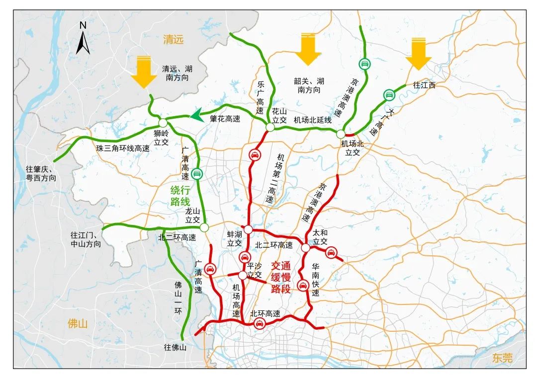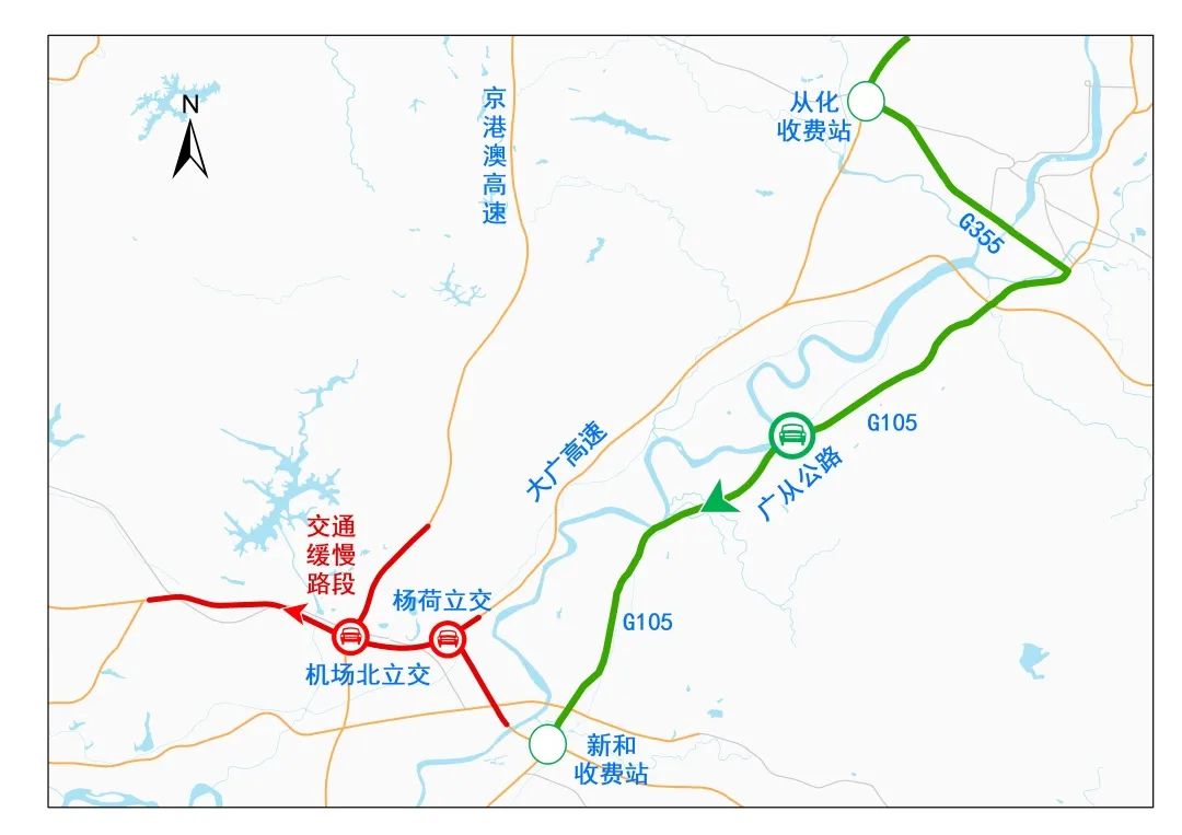 其中,为避开机场北立交、杨荷立交南行行车缓慢,建议大广高速返程市民在从化收费站经国道G355,通过G105绕行进入市内。