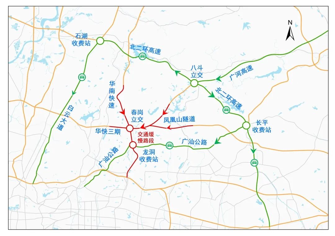 为避开春岗立交段行车缓慢,建议粤东地区返程旅客通过北二环高速长平收费站转广汕公路进入市区,或者进入广佛肇高速凤凰山段黄麻收费站转广汕公路进入市区。