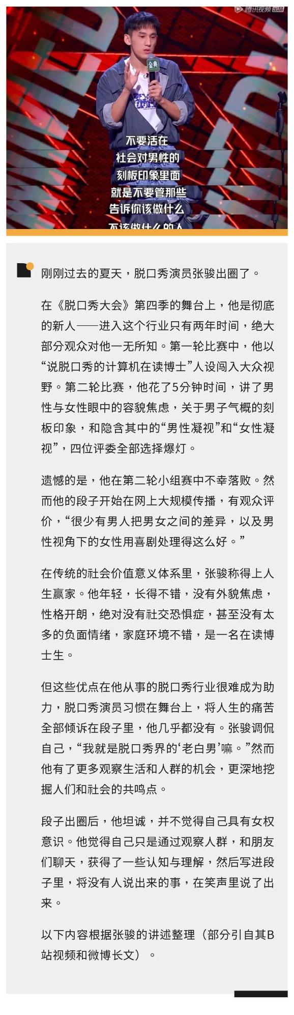 说实话,我不能说有女权意识吧。换个角度说,男人几乎不可能共情女性。因为我们是既得利益者,我们有非常多的优势,我们的特权就是我们感受不到任何的限制。我在台上讲的东西也不是说真的女权,我只是讲了一些我观察到的男女差异。我有权利平和地说出这些简单的差异,也会有人来听我讲,这还是我(男性)权利的体现。