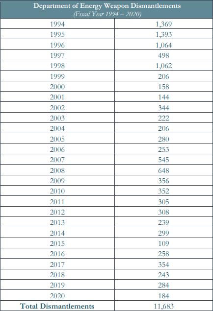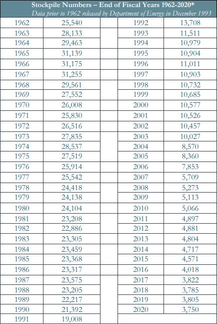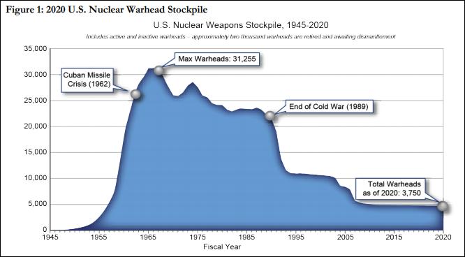 声明还称,目前的最新数据与1967年财政年度结束时的最大库存总数(31255枚)相比,减少了约88%;与1989年年底冷战时期柏林墙倒塌时(22217枚)相比,减少了约83%。此外,声明附件中还列出了从1945年至2020年期间,美国的核弹头库存数量。