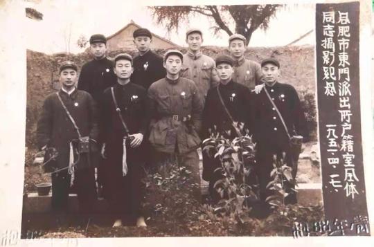 1949年1月21日,合肥宣告和平解放。2月中旬,合肥市人民政府接管了国民党旧警察机构,建立人民公安机关。1949年9月,根据华东军政委员会关于10万人口以下不设行政区的决定,原市辖区公安分局改为警政合一的公安派出所,1950年5月,全市由原来的9个公安派出所改为5个公安派出所。本张照片提供者——徐乐新(第一排左起第一),他所在的东门派出所就是其中之一。