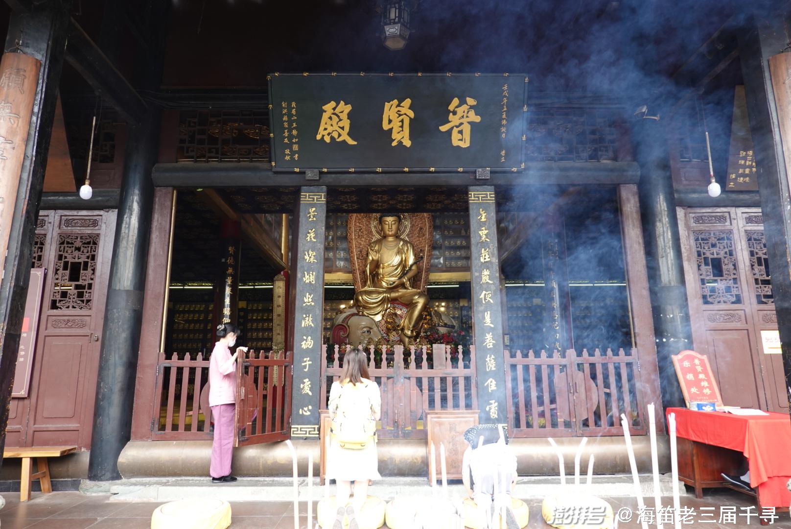 穿过牌坊,进入朝拜区,过了孔雀明王殿,便是韦驮殿兼四大天王殿,弥勒殿等。这些殿宇的斗拱,翼角凌空而起,具有强烈动感,将殿之沉静与拱之灵动动静结合, 让人震撼。大佛寺的观音殿的观音菩萨神像特美体现了女性的慈悲,莲花金刚座,莲花柱头绕殿四周,慈眉善目的观音在上俯视。据说,上到顶层的外回廊,可以近看大佛禅院的全景,可远眺峨眉山市,但因疫情没有开放,我们没能上去。观音殿后面是普贤殿,外观呈重檐方形,镏金攒尖屋顶,屋面铺设赭色琉璃瓦,铜铸金色宝顶,装有代表五方五佛的五根宝杵。墙体由芝麻白花岗岩垒砌,官式门拱,地面为朝霞色花岗石,外墙壁下为黑色花岗石须弥基座,殿内屋顶有用柚木制作的宋式穹隆藻井。普贤殿整个建筑,敦实凝重,轮廓挺拔,据说在国内殿堂建筑风格中独树一帜,是当今仿古建筑中的经典之作。