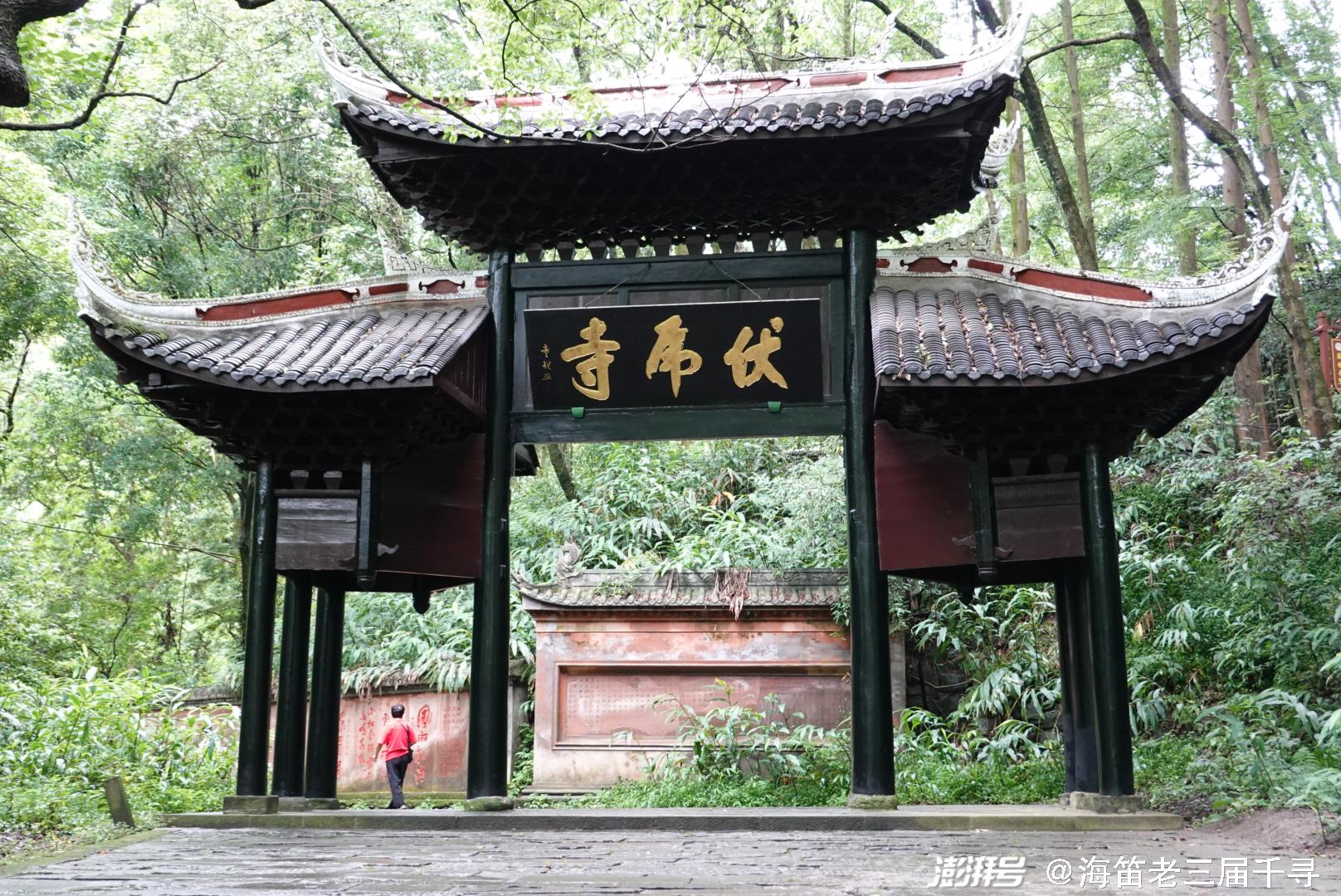 出报国寺左行,沿瑜珈河而上,行约一公里,过虎溪桥,进入丛林,连登三个石坡,就是伏虎寺。伏虎寺建于南宋绍兴年间,距今已有八百多年的历史了,当初为峨眉山第一大寺,因寺后的山像一只伏卧的老虎,故叫做“伏虎寺”。明末清初,伏虎寺庙宇遭毁。清顺治八年(1651),贯之和尚率徒重修,更名虎溪精舍,历时二十年,建成十三重殿宇的巍峨大庙。