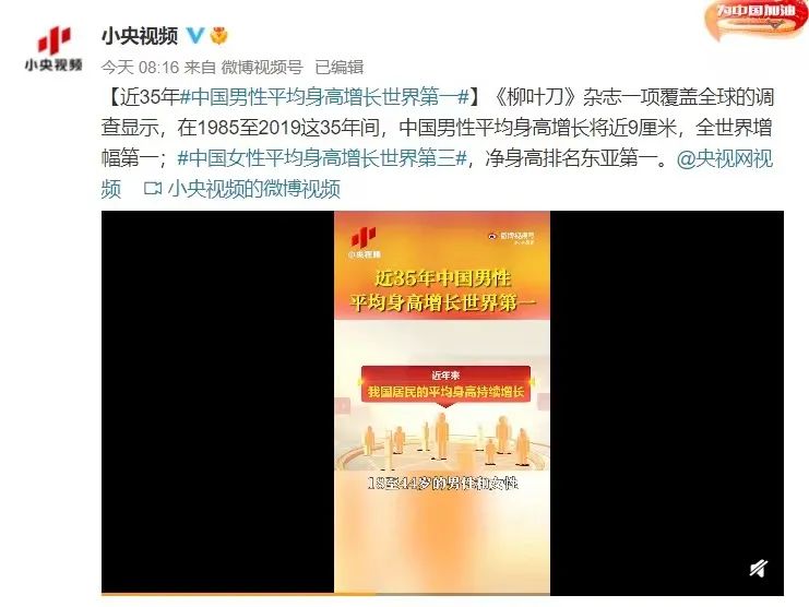 《柳叶刀》杂志一项覆盖全球的调查显示,在1985至2019这35年间,中国男性平均身高增长将近9厘米,全世界增幅第一;中国女性平均身高增长世界第三,净身高排名东亚第一。
