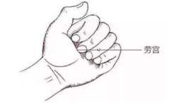 劳宫穴在我们的手掌心里,当第2、3掌骨之间偏于第3掌骨,屈指握拳时,中指指尖所点处就是该穴。