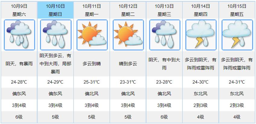 预计今天,受热带低压外围环流影响,中北部有中到大雨局部暴雨,南部沿海有大雨到暴雨,气温25到28度,沿海阵风可达8到9级,请注意防御。预计9日至10日,受热带系统环流影响,骤雨频繁,有暴雨局部大暴雨,期间沿海风力可达8到9级,注意海上交通和海岛旅游安全;11日至12日降雨减弱,多云到晴;展望13日至15日降雨再趋明显。