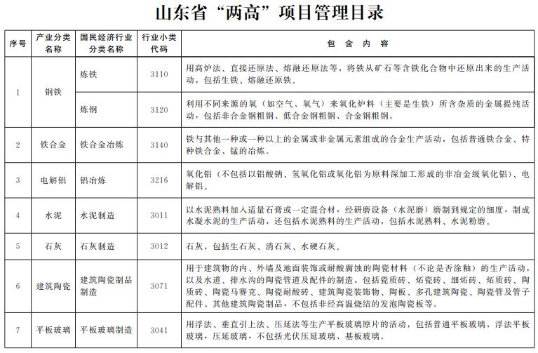 明确“两高”项目范围界限。统筹考虑能耗排放总量、万元工业增加值能耗,将“六大高耗能行业”中的煤电、炼化、焦化、钢铁、水泥、铁合金、电解铝、甲醇、氯碱、电石、醋酸、氮肥、石灰、平板玻璃、建筑陶瓷、沥青防水材料16个行业上游初加工、高耗能高排放环节投资项目作为“两高”项目。“两高”项目范围根据国家规定和山东省实际动态调整。