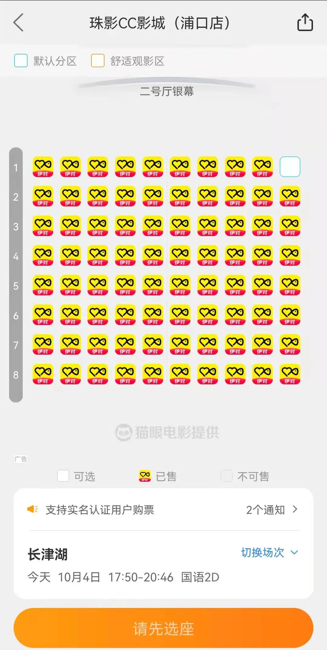 今年的电影国庆档有多火?10月4日,记者购买南京浦口区珠影CC影城17时50分的《长津湖》电影票时发现,80个座位的影厅,仅剩下两个空位。