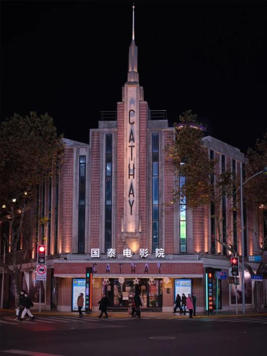 国泰电影院原名国泰大戏院,由鸿达洋行设计,钢筋混凝土结构,1932年竣工,属典型的装饰艺术派风格。影院外墙用紫酱红的泰山砖,白色嵌缝,大门出入口处外立面,由两侧对称逐级向上升并向中央收缩,使外立面中央最高处显得十分雄伟,外立面采用坚线条处理,通贯上下的四条长窗与紫酱红泰山砖相间形成条状。