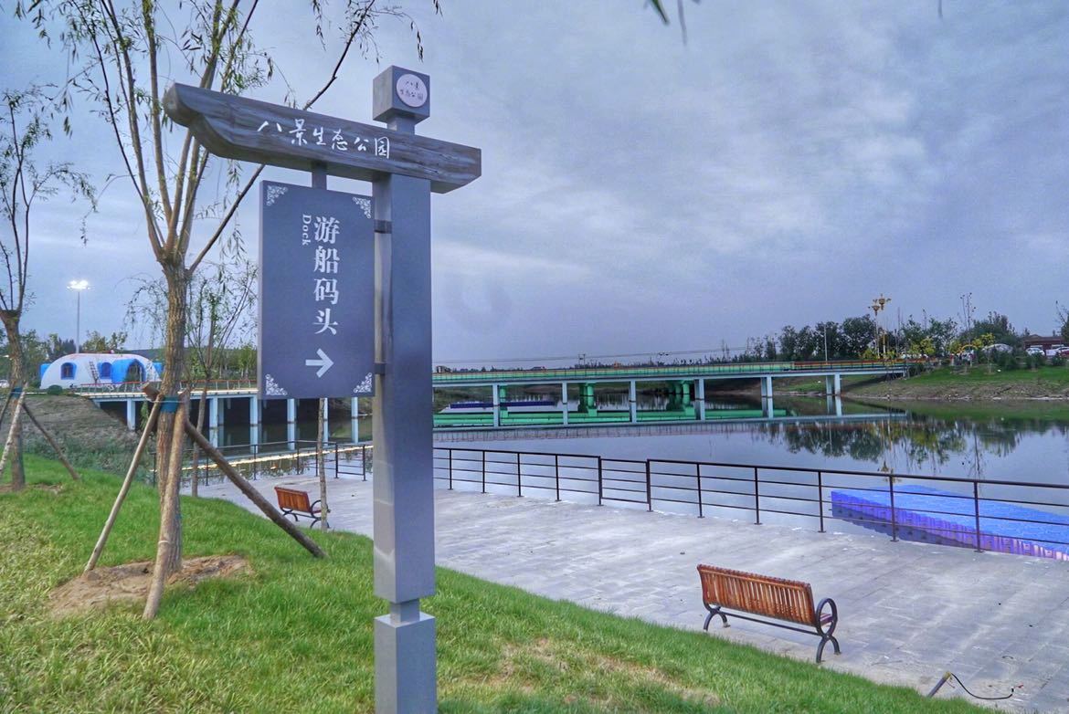 这处开放式公园集文化、活动、生态、休闲为一体,以八景寻迹为主题,分别为杜烟村雨、郭村晚照、沙岸梨花、长河枫叶、渡口渔舟、平川猎马、曲园消暑、高阁临秋八个主题板块,用绿道串联主要景观节点,展示枣强民俗文化,为北部新城发展提供绿色基底。