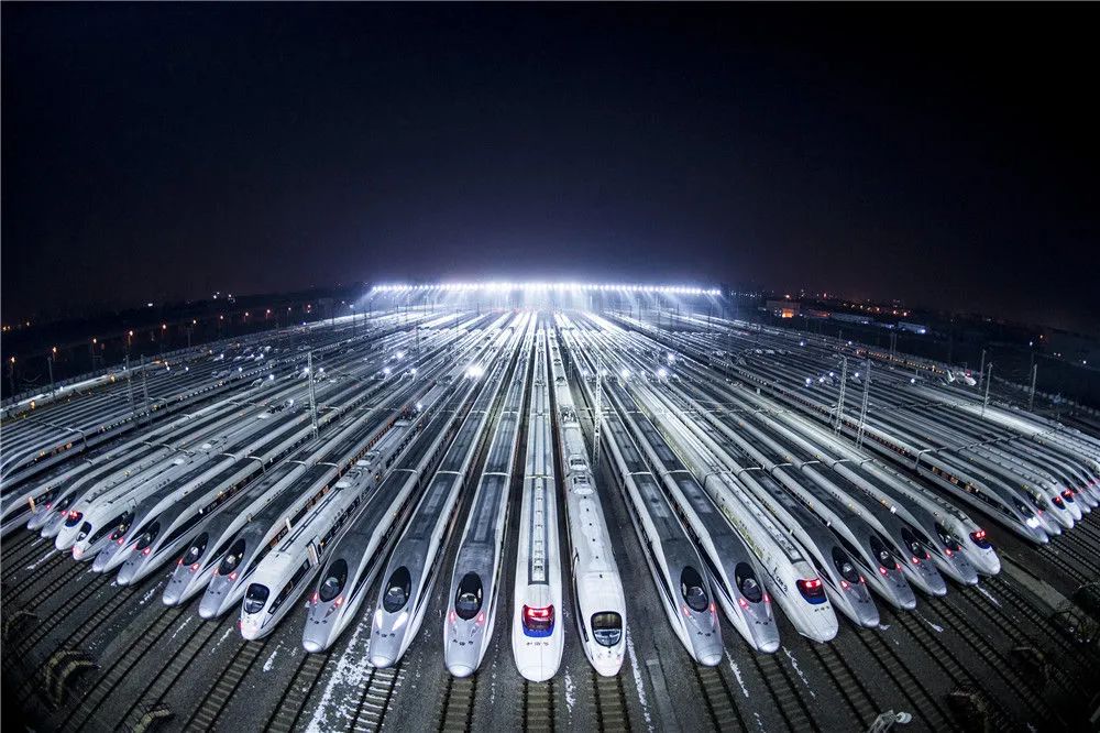 动车组停靠在武汉动车段的存车线上,准备进行检修和保温作业(2018年2月1日摄)。新华社记者 肖艺九 摄