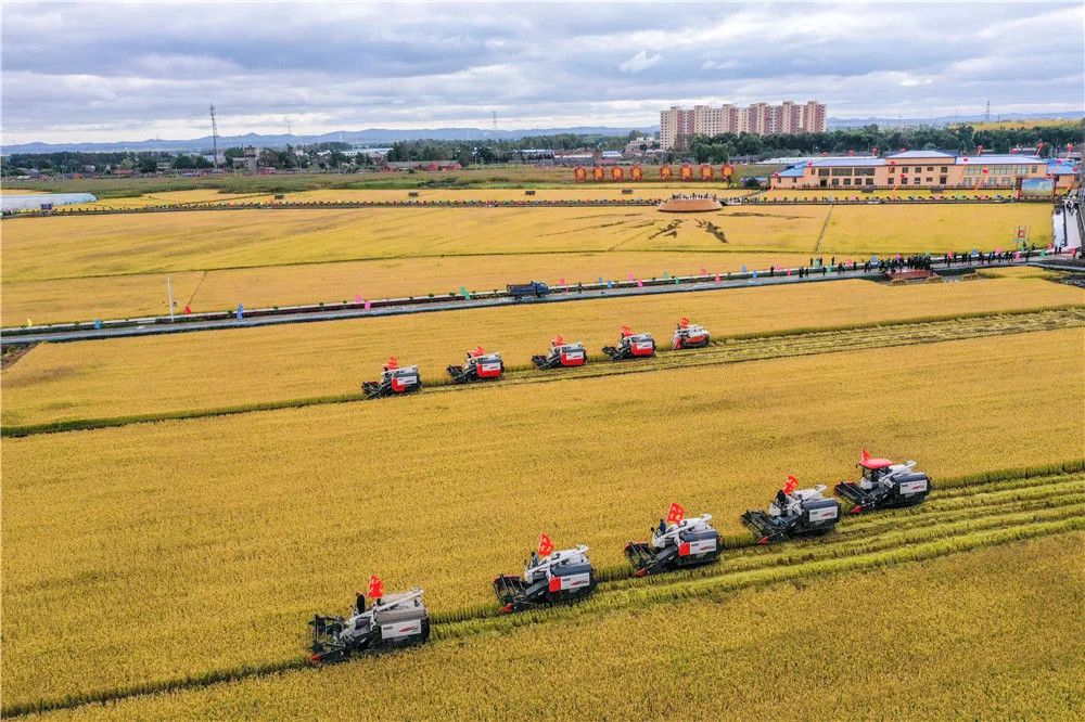 在吉林省长春市九台区龙嘉街道红光村,农民驾驶农机进行水稻收割作业(9月23日摄,无人机照片)。新华社记者 张楠 摄