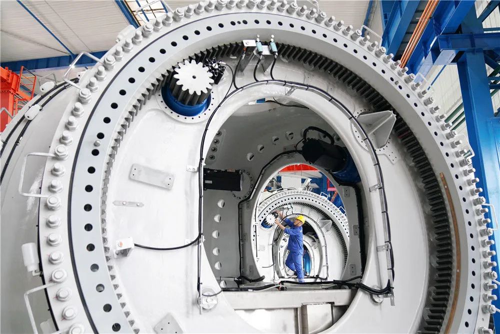 在位于黑龙江省齐齐哈尔市的中国一重集团有限公司风电装备生产制造厂生产车间,工人在进行生产作业(7月1日摄)。新华社记者 王建威 摄