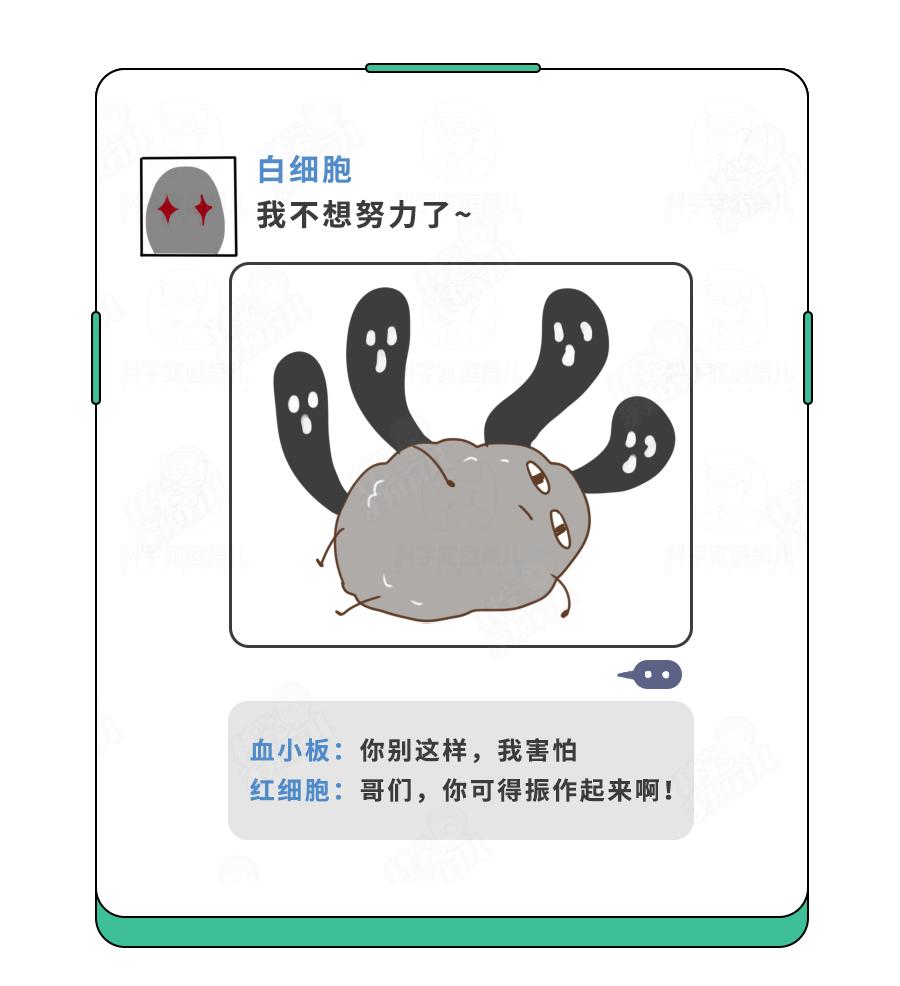 ②贫血。白细胞黑化之后,红细胞和血小板也会受到影响,所以有的人会感觉到浑身没劲儿,老想“葛优躺”,稍微干点活就疲乏。