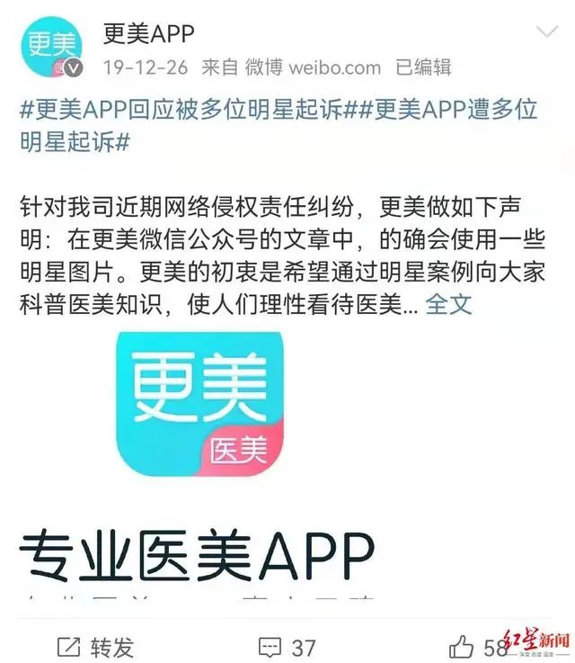 对此,更美APP曾于2019年12月26日在官方微博公开向多位明星致歉称,“之所以在微信公众号中使用明星的公开剧照或生活照片,初衷是希望通过明星照片将晦涩的医美知识通俗易懂地传递,使人们理性看待医美,建立正确的医美消费观,不冲动整形、无审美整形”。