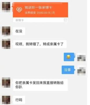 然而在商量好价格、快递等详细信息之后,奇怪的事情发生了。女孩没有如先前所说的直接转账,而是发了一张额度为2000的“亲情卡”过来,并且声称自己太着急了发错了,要求小A退回一张同样额度的“亲情卡”。